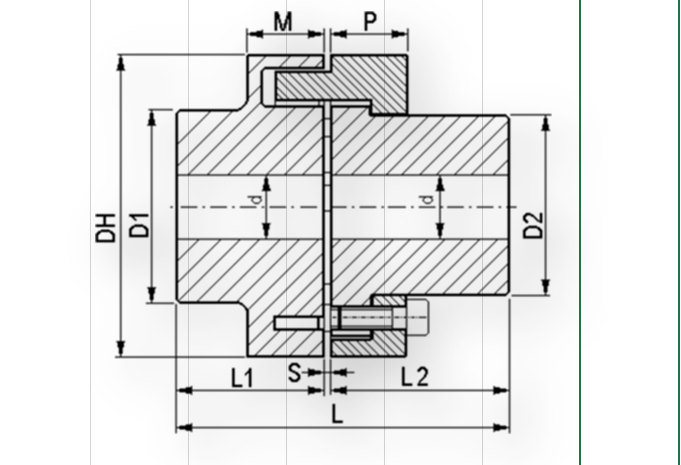 | TİP | Nominal Moment TKN(Nm) | Ortalama Ağırlık (Kg) | d1 - min. | d2 - max. | DH(mm) | D1(mm) | D2(mm) | L1(mm) | L2(mm) | M(mm) | P(mm) | S(mm) | L(mm) | Cıvata Ölçüleri | Cıvata |