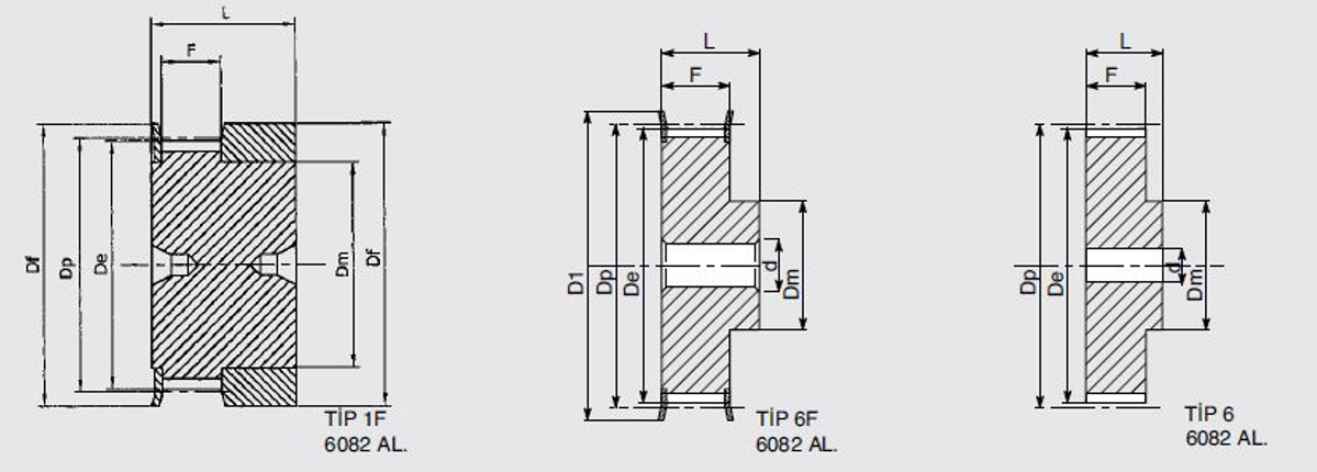 | Ürün Kodu | Tip | Diş Sayısı | Dp | De | Df | Dm | F | L | Pilot Delik | Kg |